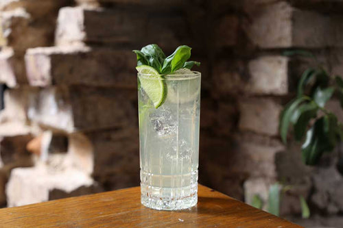 Alle Zutaten mit Eiswürfeln in einem Longdrinkglas verrühren. Mit einem Stück Limette und auf Wunsch zusätzlich mit Basilikum garnieren.