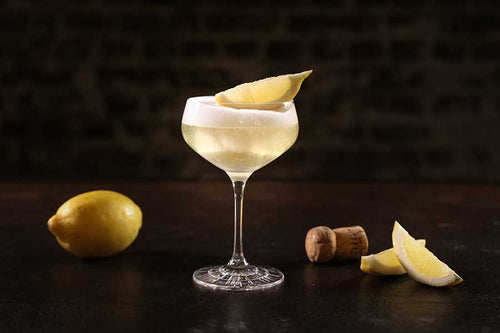 Eine Kugel Zitronensorbet in eine Cocktailschale geben. Die flüssigen Zutaten über das Sorbet gießen und mit einem Stück Zitrone garnieren.